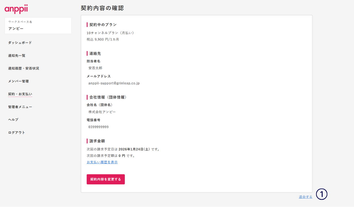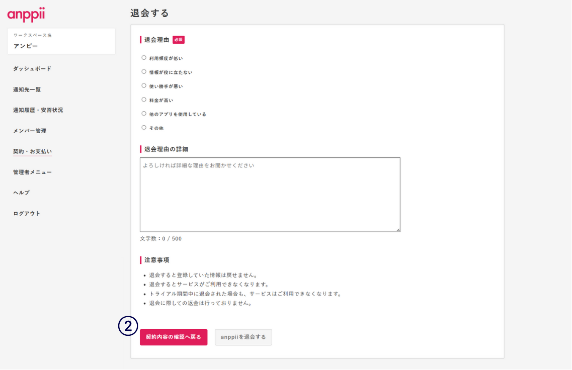 退会の流れ①共通メニューの「契約・お支払い」リンクをクリック後、下部にある「退会」リンクをクリックしてください。②退会理由を選択・記入後、「退会する」ボタンをクリックしてください。③「anppiiを退会しました。」画面が表示されたら、退会完了です。