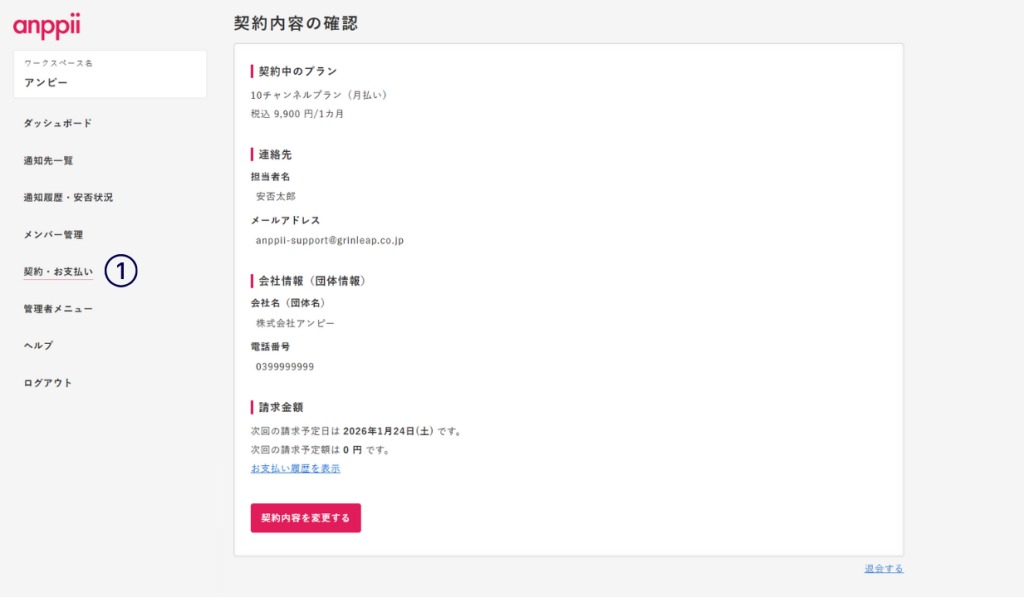 ①共通メニューの「契約・お支払い」リンクをクリックし、契約中の内容が確認できます。