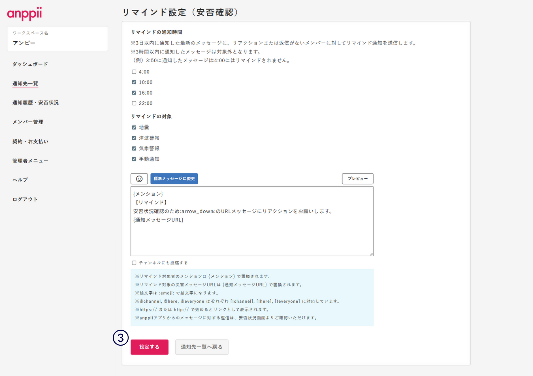 リマインド機能について①共通メニューの「通知先一覧」をクリックすると、通知先一覧が表示されます。②対象の通知先の「リマインド設定」ボタンをクリックしてください。③リマインドしたい通知時間を選択し、通知メッセージを編集後、「設定する」ボタンをクリックしてください。④「リマインドの設定が完了しました。設定内容をもとにanppiiからリマインドされます。」と表示されたら設定は完了です。